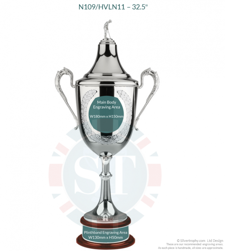 Handmade in Britain, this Swatkins nickel plated golf presentation trophy cup features a highly polished body, stem and foot and includes laurel wreath style handles and a golf figure lid. It is also beautifully handchased with a laurel wreath design on the front and plain on the back. It is supplied complete with a nickel plated plinth band on a mahogany plinth. Only the finest materials have been selected to manufacture these revolutionary awards. Keeping traditional values and Great British quality.
