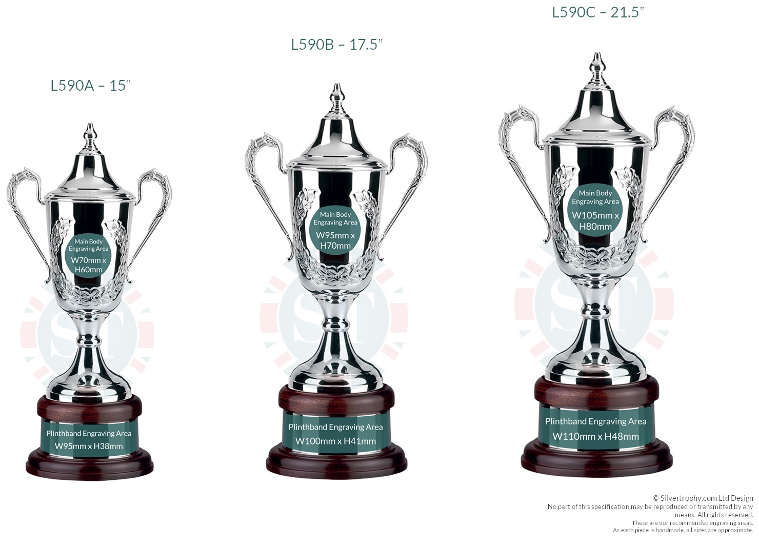 Handmade in Britain, this Silver Plated presentation trophy cup features a highly polished body, stem and foot and has laurel wreath style handles. It has a beautiful hand chased laurel wreath on the body. It is supplied complete with a mahogany plinth, Silver Plated Plinth Band and a plain lid.